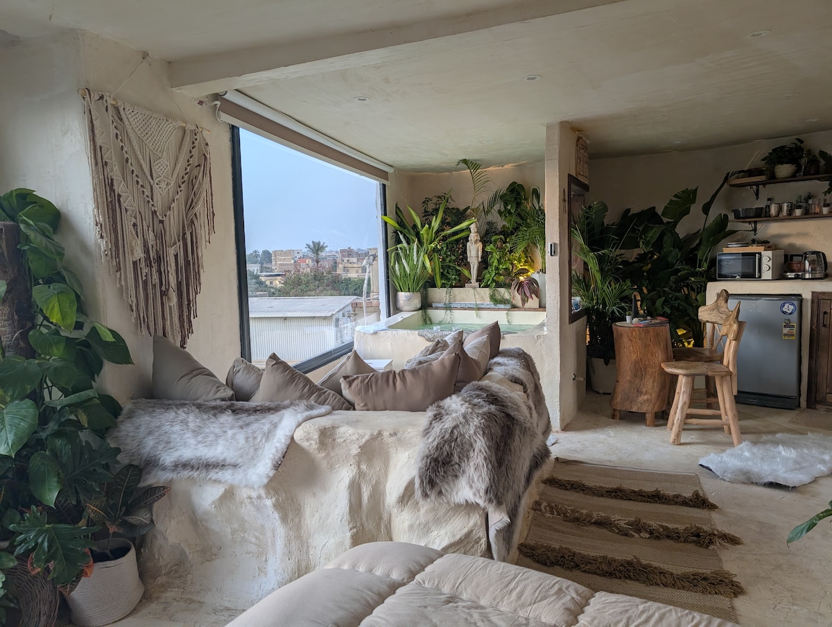 Escape to a one-of-a-kind artistic retreat, where nature and design come together in perfect harmony. This handcrafted studio, just a 5-minute walk from the Pyramids of Giza, offers an immersive experience with natural materials, bespoke handmade furniture, and breathtaking pyramids views right from your private jacuzzi.