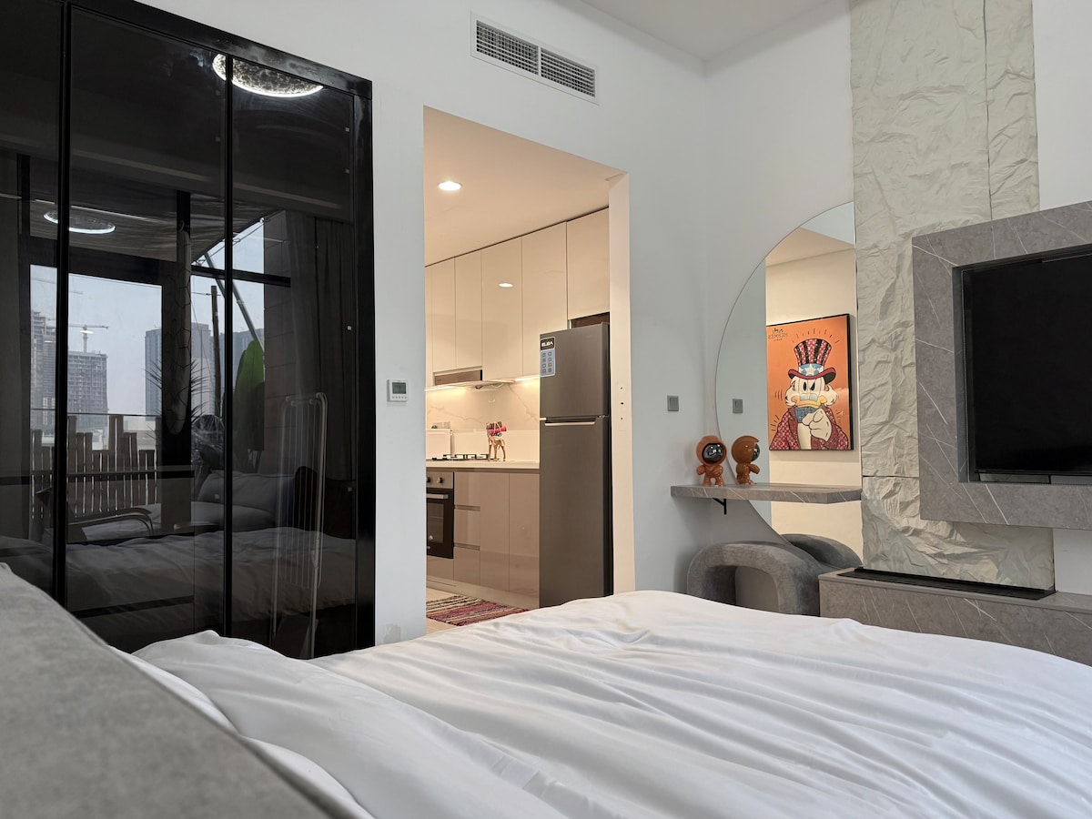 Experience elegance and comfort in our chic studio apartment with a large terrace in Downtown Dubai. Overlooking the Dubai Water Canal and within walking distance of Dubai Mall and Burj Khalifa, it’s the perfect base for your stay. Inside, enjoy a king-size bed, fully equipped kitchen, free WiFi, smart TV and complimentary parking. Whether traveling for business or leisure, our apartment blends style, comfort and location for an unforgettable Dubai experience.