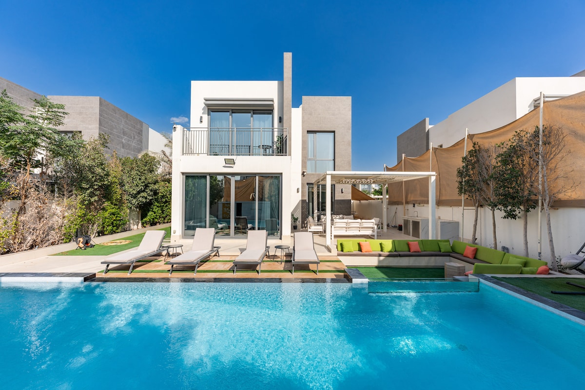 This modern, luxurious 5-bedroom villa comfortably accommodates 9 guests. Enjoy 5 stylish bathrooms, an open-plan kitchen with state-of-the-art appliances, & spacious living/dining areas. Relax in the outdoor kitchen with a built-in BBQ, comfy sofa, & freshwater pool. Located in Dubai Hills Estate, it's just 15 min from downtown Dubai, with biweekly cleaning & disinfecting for a pristine, stress-free stay. It's a perfect home away from home, with every detail designed for your comfort & privacy!