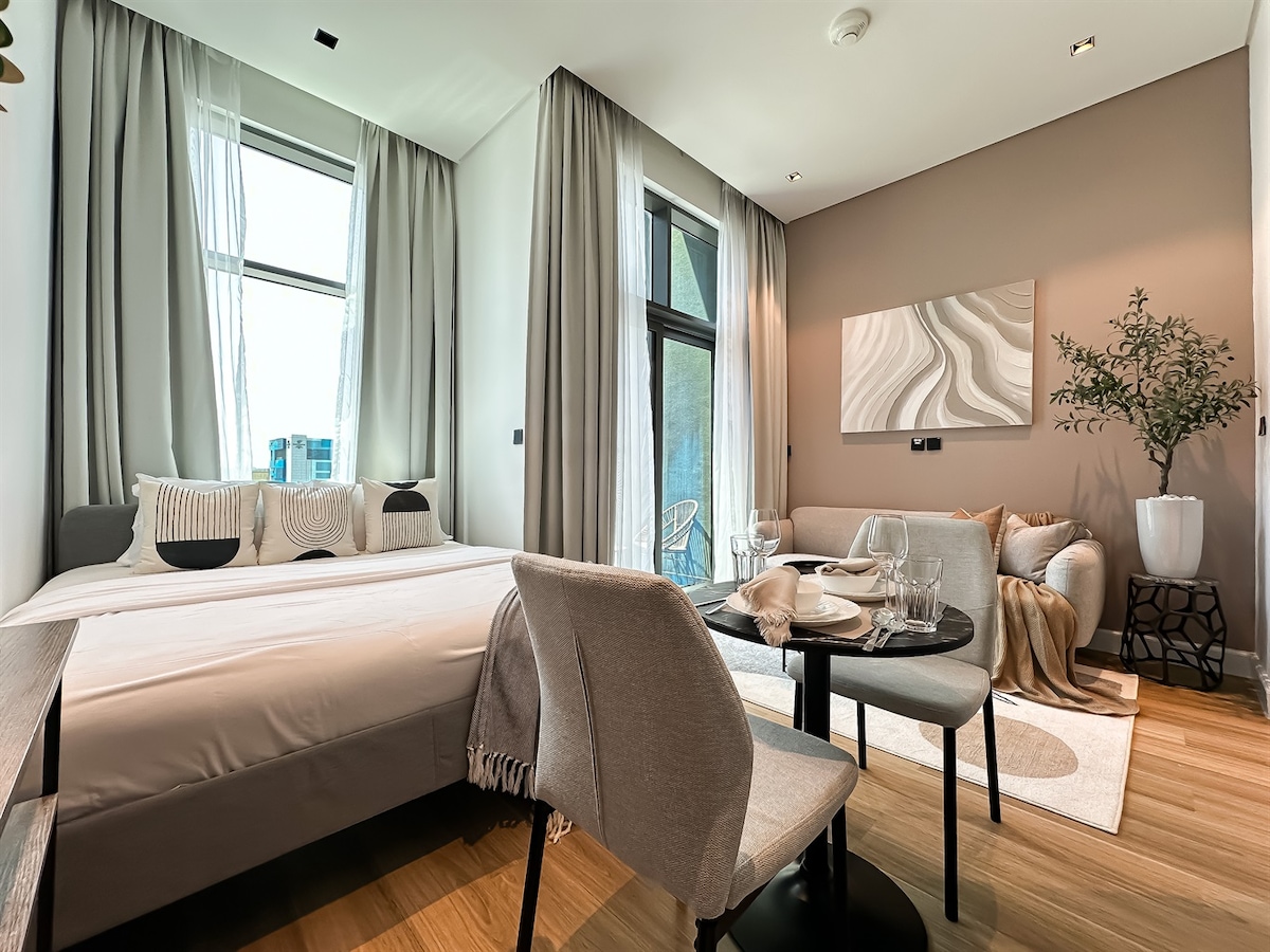 This unique place has a style all its own.Welcome to your stylish studio in JVC, where modern comfort meets urban convenience. Start your day with freshly brewed specialty coffee from the bean-to-cup coffee machine while enjoying the views from your private balcony. The studio features a cozy king-sized bed, a sleek kitchenette, and a modern bathroom. Perfect for a relaxing and unforgettable Dubai stay. Book Your Stay Now!