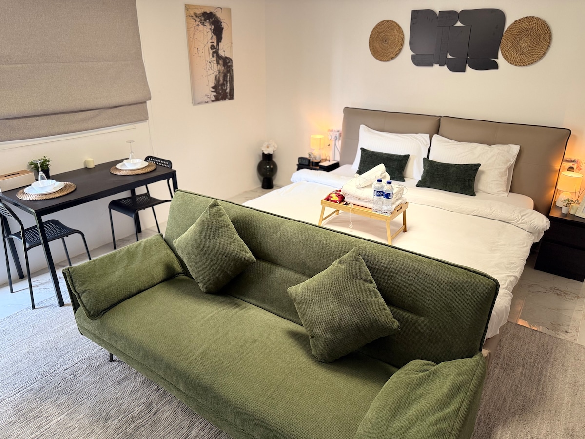 Enjoy total privacy in this fully private, non-shared studio, perfect for couples or solo travelers. Located just 10 minutes from Downtown, you’ll be close to Dubai’s top attractions. Oasis Mall is a 5-minute walk, and right across the street you’ll find a petrol station and KFC for quick essentials. Getting around is easy with a bus stop 5 minutes away, connecting you to the nearest metro in just 2 stops. After exploring the city, relax and unwind in this stylish Boho-inspired studio 🍂