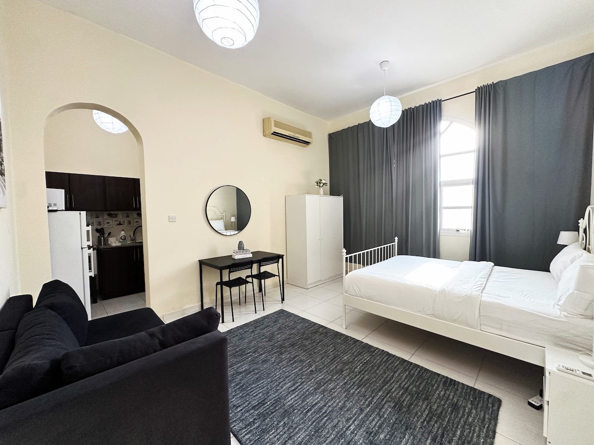 Welcome to my spacious studio. Inside sits a King sized bed and pull out couch, comfortably accomodating 4 people. Designated office area, equipt with comfy desk chair, and WiFi for meetings. Full bathroom and kitchen with everything needed for short or long term stays. Outside boasts a large balcony, with a cozy 3 person bench and 2 study glass tables to enjoy a morning breakfast or coffee with. 5 mins to the airport, 10 mins to Yas island, 25 mins to downtown Abu dhabi, and 50 mins to Dubai.