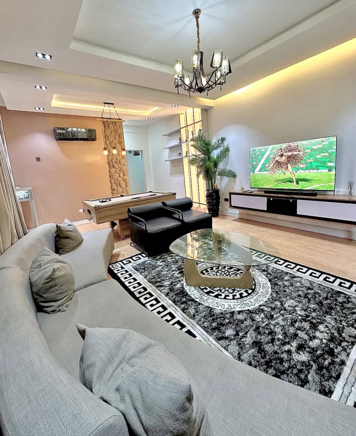 Pinewood suite , a contemporary 2 bedroom Apartment intentionally furnished with you in mind. The woodwork is unique and detailed to give our guests an unforgettable experience in a clean environment. It is furnished with smart Tv, smart door, fast and efficient wifi, Swimming pool, table tennis, snooker table, standby generator, solar powered inverter air conditioning units, water heaters and a fully equipped open plan kitchen concept. Have fun with the whole family at this stylish place.