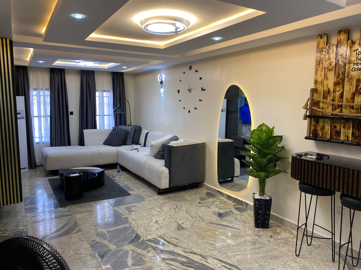 Royalty Luxury Serviced Apartment was concieved & designed as a home for Royals. It’s quiet, unique, stylish & homely with exquisite furnishing to give a feel of a comfy home. Located in a serene secured gated estate and offers convenient access to all part of Abuja and it's environs. 247 electricity with solar/Inverter systems, Fiber Optic wifi, fan, fully fitted modern kitchen, armed security, quiet neighborhood. Standard pool table, relaxation swing, private swimming pool & washing machine.