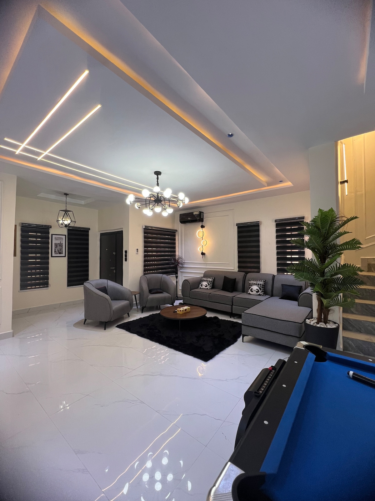 Royalty Luxury Serviced Apartment was concieved & designed as a home for Royals. It’s quiet, unique, stylish & homely with exquisite furnishing to give a feel of a comfy home. Located in a serene secured gated estate and offers convenient access to all part of Abuja and it's environs. 247 electricity with solar/Inverter systems, Fiber Optic wifi, fan, fully fitted modern kitchen, armed security, quiet neighborhood. Standard pool table, relaxation swing, private swimming pool & washing machine.
