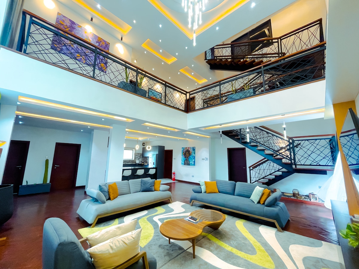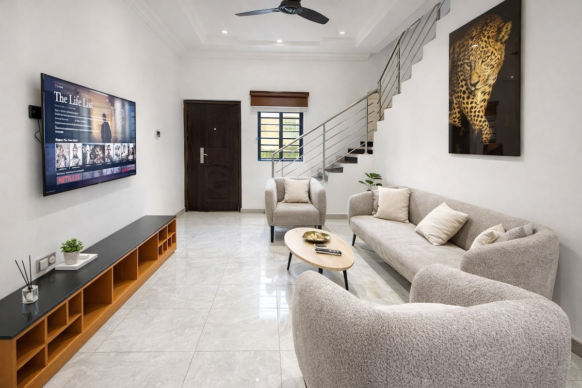 ☞ Private Pool (3.5 ft. shallow end, 6.5 ft. deep end, 10x23 pool) 🏊 ☞ Starlink 250+ Mbps WiFi ✭ Cozy King Size Beds (180x200 cm) 🛏️ ✭ Private Lux 7-seater SUV w/ chauffeur 🚘 ✭ Daily Cleaning available 🧹 ☞ Backup Generator for 24/7 Power ☞ 3850 sq. ft home ☞ 5 Smart TVs w/ Netflix DSTV & Local Channels (largest is 75 inches) ☞ Parking (onsite, 4 cars) ☞ Washer + Dryer ☞ Samsung 11.1.4 Surround Sound Bluetooth speakers ☞ Fully equipped + stocked kitchen ☞ A/C 》25 - 30 mins to the airport