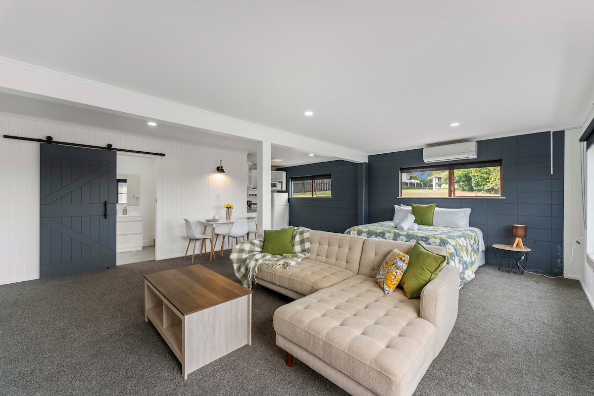 Only 2 mns drive from shop, restaurants, lake beaches, and bike tracks. 8 mns from Taupo centre. This charming self contained studio is situated at the rear of our garage, and detached from our house. It's a large open space (60m2), well decorated . Overlook on 1 acre of garden.Very peaceful and quiet surrounding. Super King Size bed, Single bed. If you book for 2 persons we will set up the Super King Size bed. Please let us know if you would like the single bed too. On parle français.