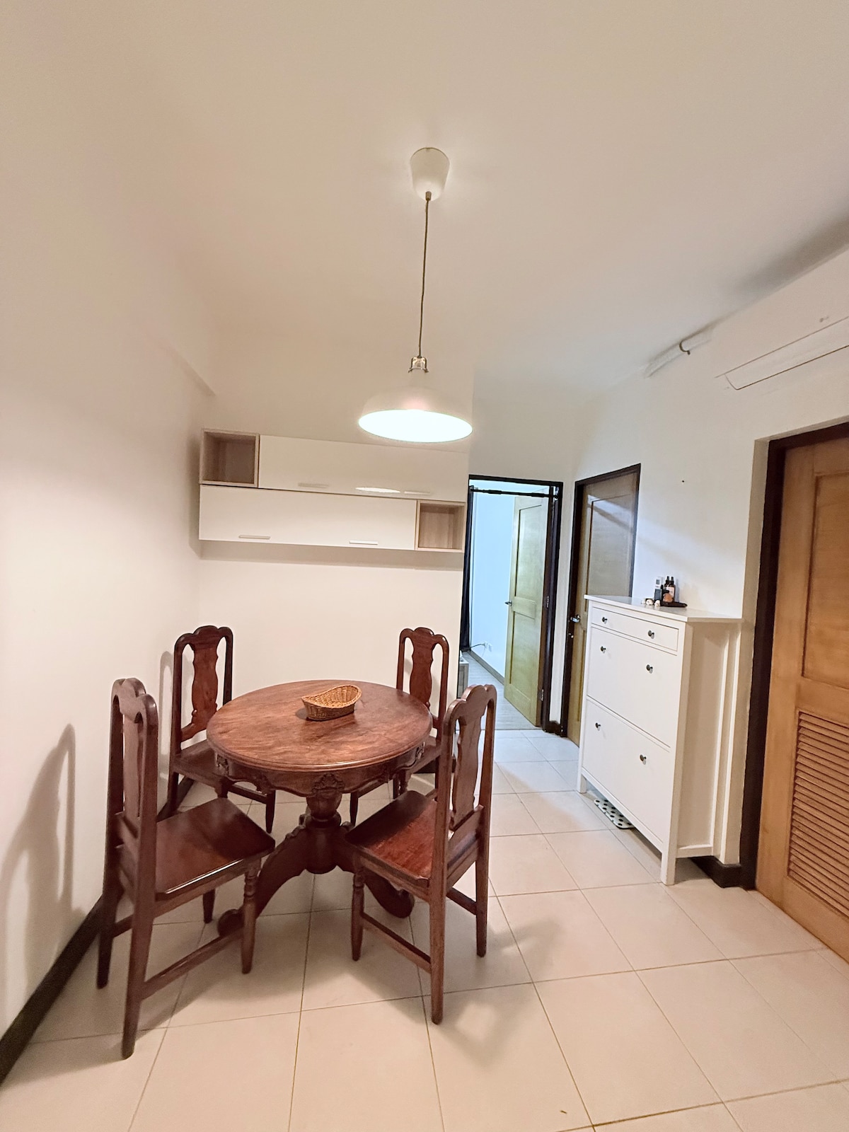 Step into this elegant 2BR home thoughtfully designed to bring warmth and relaxation to your stay. The living area & dining space are styled with neutral tones and lush green accents, creating a cozy yet sophisticated atmosphere, perfect for unwinding after a long day. Start your mornings or end your evenings on the private balcony, where you can sip a cup of coffee or tea while enjoying serene views of the lush greenery and the pool below. It’s a peaceful escape right in the heart of the city.