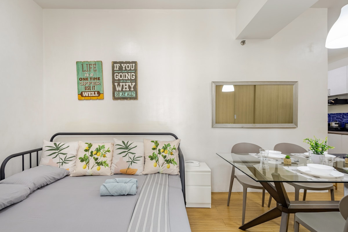 Experience style and convenience in this modern BGC studio! Just a 2-minute walk to Venice Canal Mall, it’s perfect for work and leisure. Enjoy a hidden pullout queen bed, an expanding table for dining or work, and an 84” projector for a cinematic experience. Steps from cafes, groceries, and restaurants, everything you need is within reach. Whether you're unwinding, exploring, or working remotely, this cozy retreat is the ideal staycation spot! 🎬🎮✨