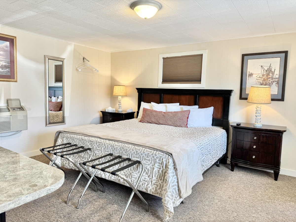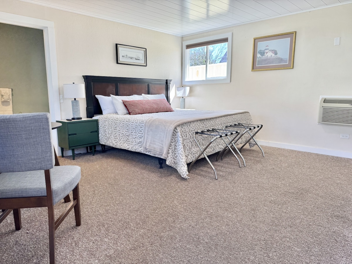 Discover the perfect blend of comfort and coastal elegance in our newly renovated Balcony King Rooms—an exceptional option among Rockland Maine hotel rooms. Located on the second and third floors, these rooms feature a plush king bed, a private bathroom, and an interior entrance for added privacy. Step onto your private balcony and enjoy stunning ocean views—ideal for a relaxing stay.