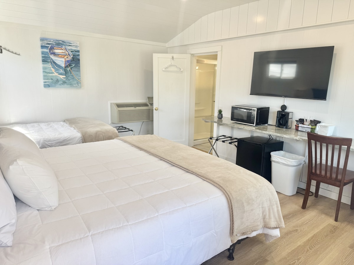 Downtown hotel room located in Queen Anne's Revenge Inn and Suites. Stay in Bar Harbor's newest hotel with an old world charm. Modern and updated amenities, bar on site, free parking, are just some of the benefits of staying at Queen Anne's Revenge. This room features a queen sized bed, private bathroom, tv, free wi-fi, heat and ac, and a mini fridge.