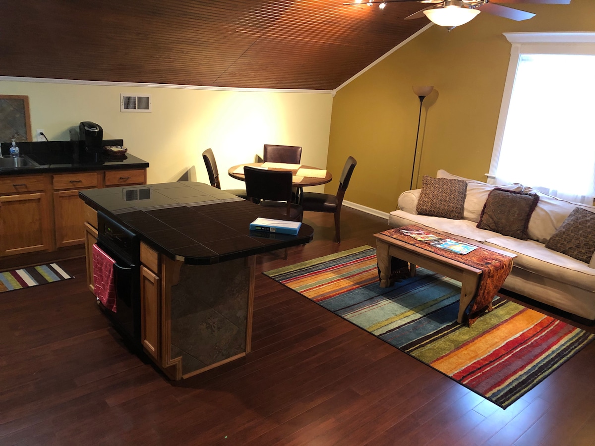 UPSTAIRS Apartment, Spacious - 700 square feet yet Homey in the HEART of Lafayette. Pictures just don't do it justice! Festival perfect!! Close to hospitals, restaurants and entertainment. World class Park nearby. 15 minutes or less from everywhere!! Parking area off the street. Kitchenette has basic cooking supplies and Keurig. Desk work area, FREE WiFi, 55" TV/Cable . Private STAIR entrance under the back patio. LOCATION is great! CENTER of town, yet in a nice neighborhood.