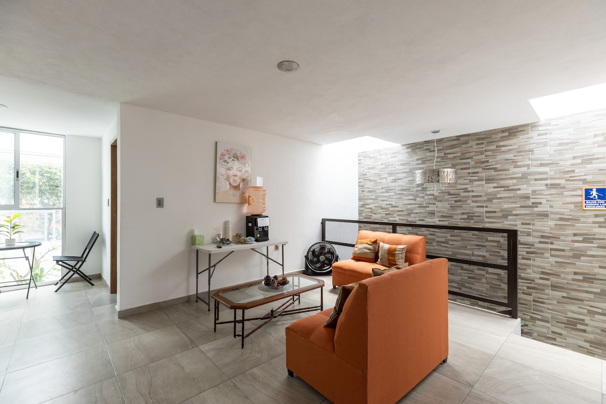 Disfruta de este cálido alojamiento monoambiente de espacios abiertos sin muros increíble para descansar y realizar tus actividades elementales cuenta con un amplio jardín, entrada independiente y cochera para un vehículo, una agradable cocina, pequeña sala de televisión y un espacio con dos camas matrimoniales se encuentra a 5 minutos de plazas comerciales y a 20 minutos del centro histórico
