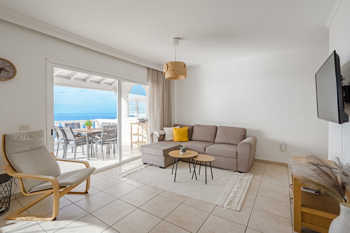 Cozy, fully equipped apartment with breathtaking ocean & Los Gigantes views from a spacious private terrace. Perfect for longer stays & remote work—fast fiber-optic Wi-Fi included. Enjoy a quiet heated pool just outside your door. Walk to the beach, restaurants, shops & tours. Ideal for couples, hikers & anyone looking to relax in comfort. Entire apartment is yours—only the peaceful rarely busy pool area is shared.