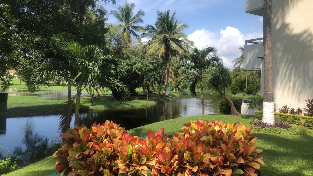 Ground floor apartment with all services and intact interiors after OTIS/JOHN. Huge pool with an amazing garden, private Jacuzzi, 24/7 security, 300 MB WIFI speed, and an equipped kitchen. Your private parking space is a few steps from the door. Located on the main Ave in the Diamante area, 7 min from the Aero and 1.2 km from the beach. 2 BRs and a living room with mini-splits, 2 bathrooms, Bluetooth speakers in the ceiling, a folding desk in the living room with views to the garden.