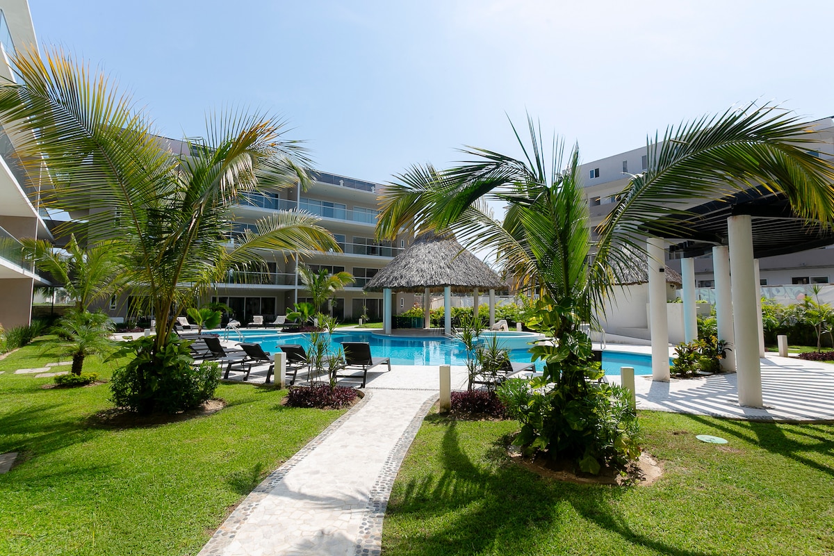 ¡Reabrimos, te esperamos con mucho gusto! Disfruta nuestra alberca y acceso privado a la playa. ¡Perfecto para vacaciones o home office! Balcón con vista increíble a la bahía. WiFi en el departamento y zonas comunes. Pantalla Smart lista para Netflix, Prime Video, etc. Espacio de trabajo en la habitación para leer o trabajar con tu laptop/tablet. El departamento está en excelentes condiciones. Aunque el condominio está en remodelación por el huracán Otis, todo es funcional.