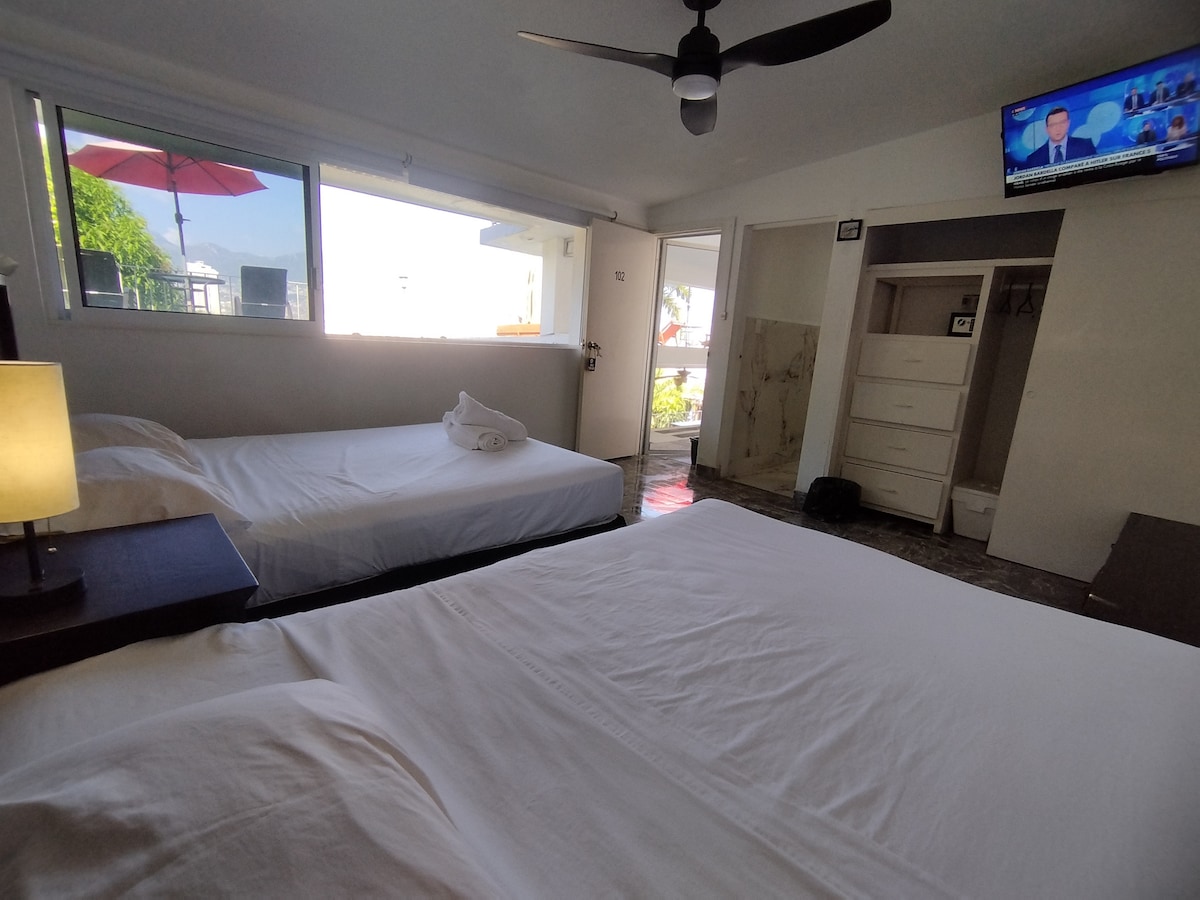 Espacio de dos habitaciones con aire acondicionado cada una, que comparten una cocineta y un baño grande. CUANDO RENTAS PARA 1 o 2 PERSONAS EL COSTO ES MUY BAJO Y SÓLO SE RENTA 1 HABITACIÓN, LA OTRA PERMANECE CERRADA. Mínimo 3 personas para hacer uso de ambas habitaciones. Contacta al anfitrión para más información. LAS ÁREAS COMUNES SE COMPARTEN CON OTRAS 3 CASAS dentro del mismo terreno. Playa a 1 minuto caminando. LA TARIFA CAMBIA CON LA CANTIDAD DE HUÉSPEDES.