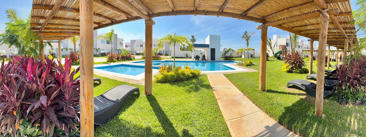 🌊Departamento con increíble terraza en planta baja, 3 Rec (principal con jacuzzi), 3 baños, cocina, sala y comedor equipados Wifi de 100 Megas, ideal p trabajar Home Office, juegos de mesa, raquetas y jenga gigante 🏝️Hermosos jardines tropicales, lagos y albercas para disfrutar de una agradable caminata 🌊Acceso a albercas con jacuzzi, juegos infantiles, snack bar, mesas de ping pong y paseo en Kayak 🌞Para unas vacaciones familiares, pregunta por el departamento de arriba con 2 recamaras