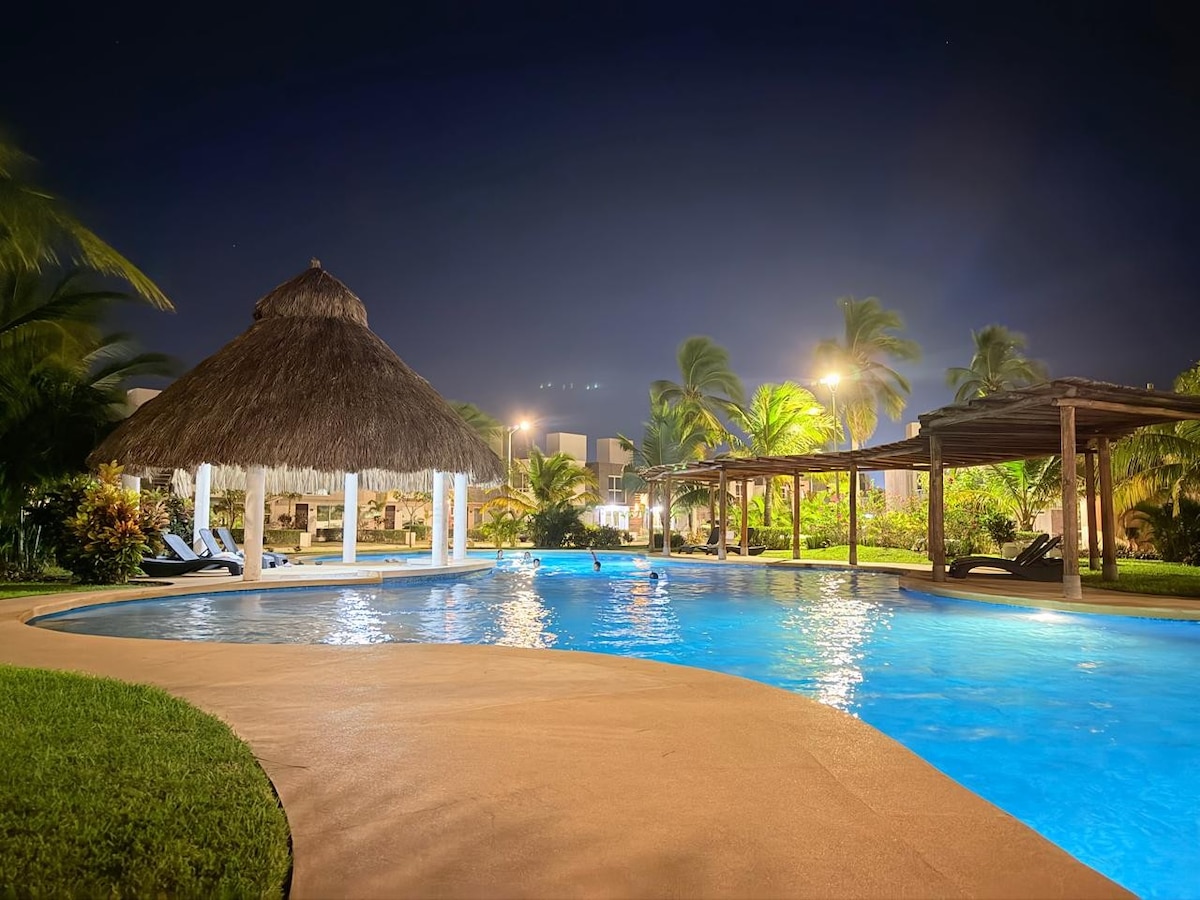 Relájate en este espacio tan tranquilo y elegante, se encuentra a 4 minutos caminando a la plaza la isla, forum, saliendo del fraccionamiento a un costado está un Oxxo, las 3B, etc. Estamos a tan solo 6 min de playa. NO CONTAMOS CON ACESO A CLUB DE PLAYA.