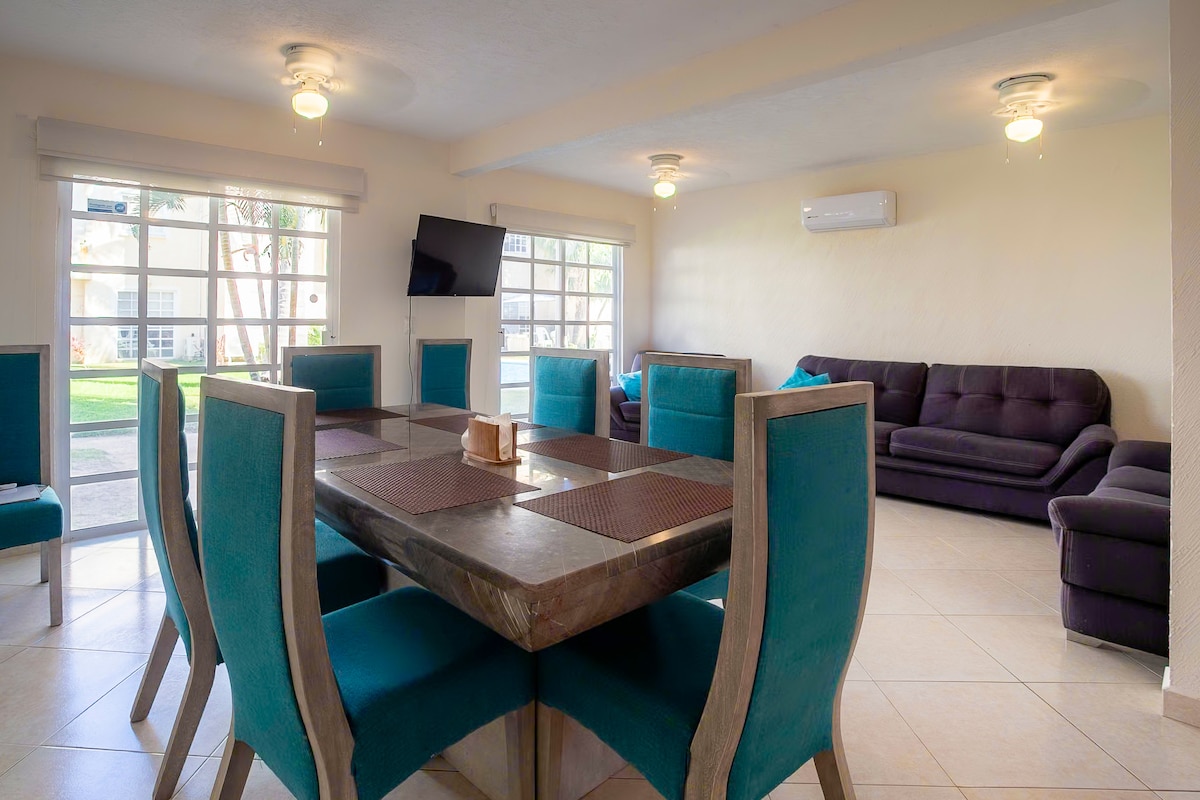 Relájate en familia en este alojamiento donde la tranquilidad se siente y puedes disfrutar de un cálido clima y una ubicación ideal para visitar Barra vieja, Playa Bonfil, plaza la Isla, a 10 minutos del Aeropuerto, la casa cuenta con Club de playa para 6 personas (7 minutos en auto), Alberca común, estacionamiento privado, Jardines, vigilancia 24 hrs y acceso controlado. Los servicios son: wifi, cocina equipada, lavadora, aire acondicionado en todas las recamaras. La llegada es Autónoma.