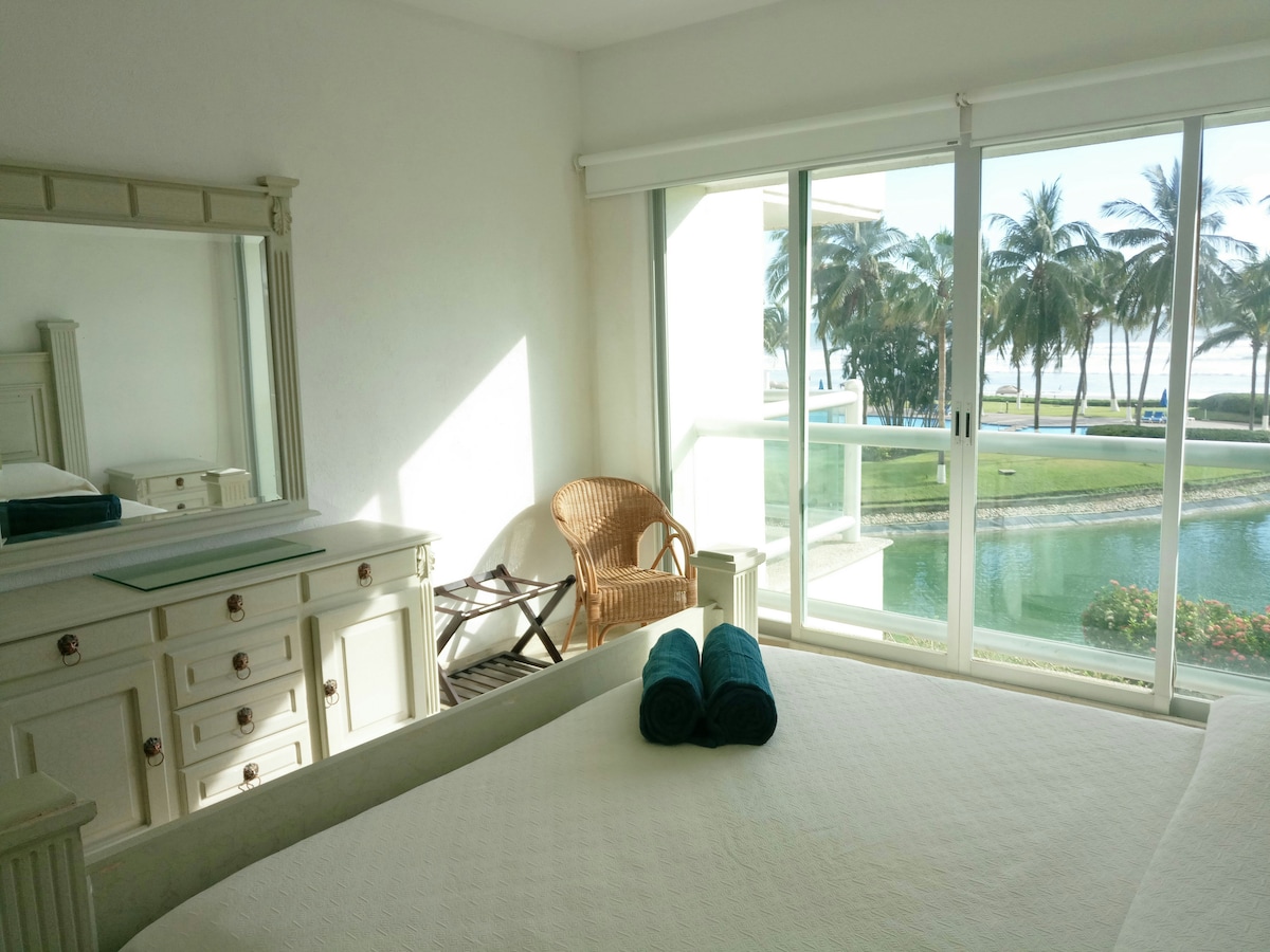 Lujoso, moderno y amplio departamento al pie del mar con vista espectacular de la bahía. El condominio tiene acceso directo a la playa, una zona de alberca con jardin, wifi gratuito en áreas comunes, sundeck y playa privada ! Ambiente relajado y familiar, seguridad las 24h y un personal muy amable y eficiente. Excelente ubicación, a un paso del club de golf, muchas opciones de restaurantes y supermercado cercanos. No se aceptan mascotas.
