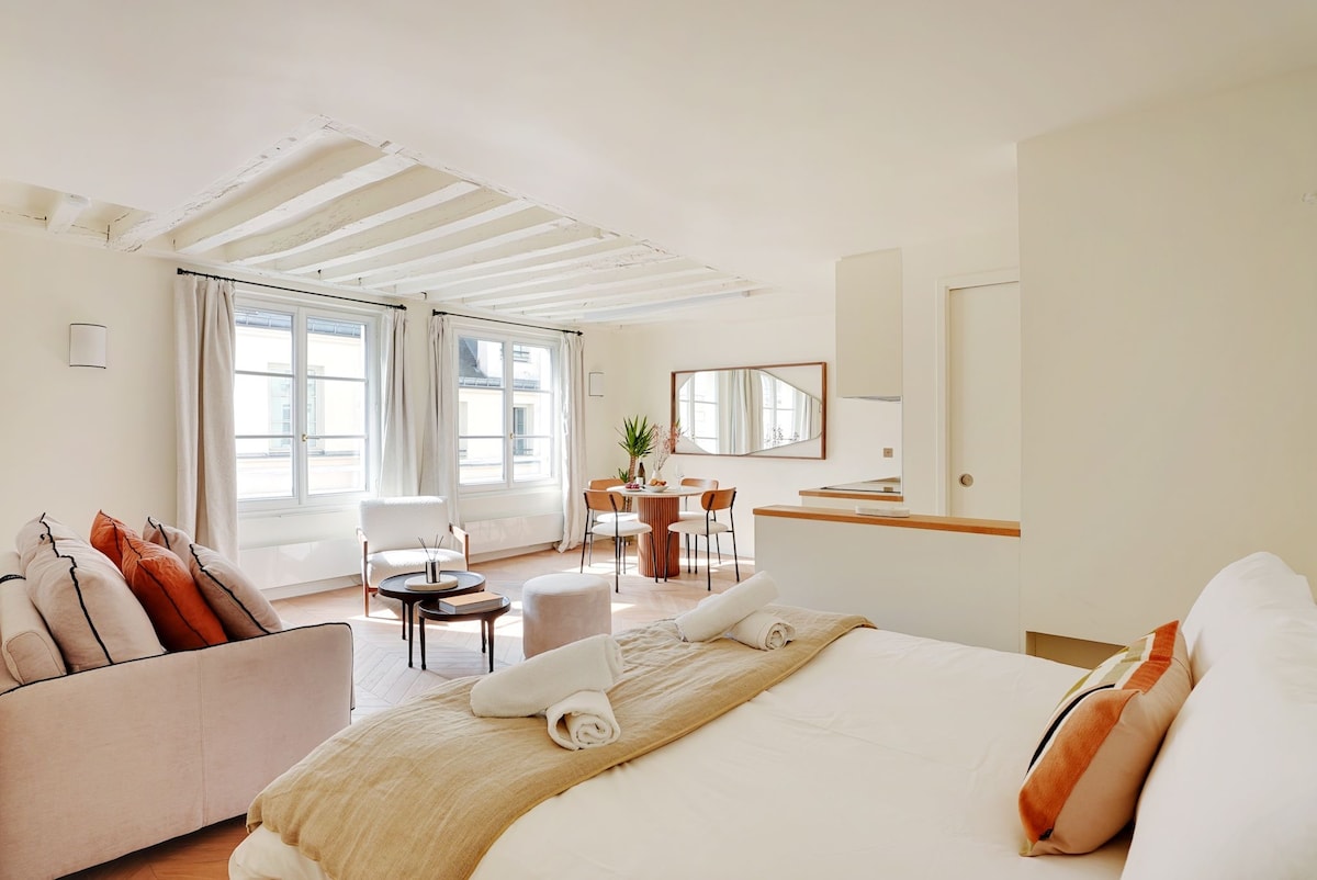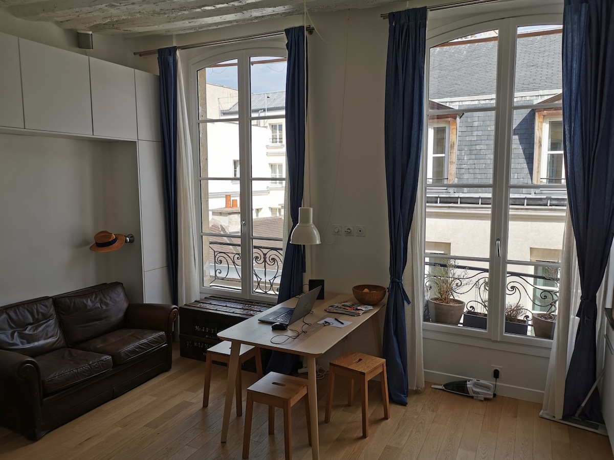 A cozy and calm shelter at Le Marais, 200m from Place de Vosges, in a 2021 renovated 1870's building with an authentic mood, original features, plus modern confort in a minimal deco. A 2nd floor by elevator giving to a quiet courtyard, it has a living room, open kitchen, bedroom and bathroom. High Speed Internet. Netflix. Walk to: Subway 3’~P.des Voges 3’ ~M.Picasso 8’~Seine's bank 13’ Pompidou's museum 18’ ~N.Dame 21’ ~C. S.Martin 23’ ~Pinault Collection 29’~Louvre 33’ S.Germain 35’