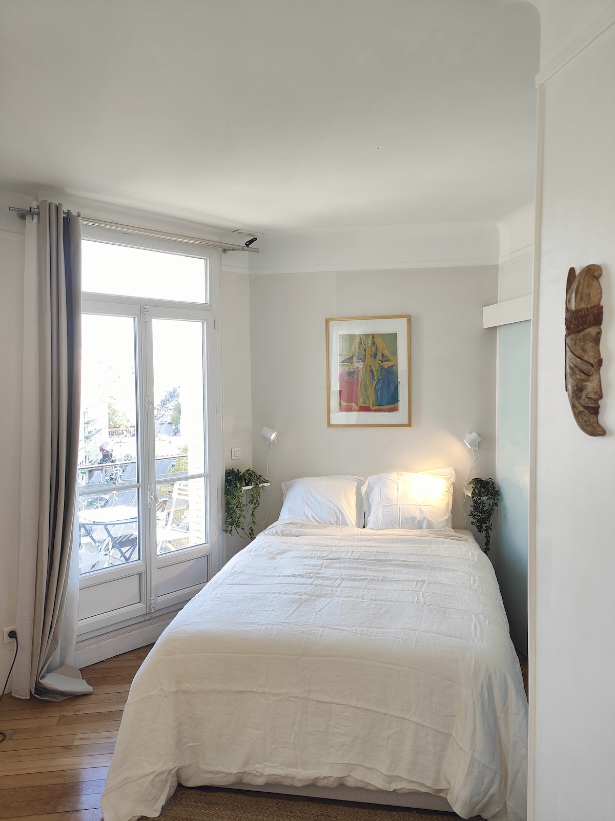The charm of an artist’s house in an oasis of nature. Designer by trade, I decorated this duplex according to my travels. It consists of a large living room with an open kitchen on the ground floor, and a beautiful room for 2 people upstairs with views of the garden. High-end bathroom and toilet freshly renovated. Welcome to the heart of Paris to discover a quiet yet secret place. I will be happy to welcome you personally.