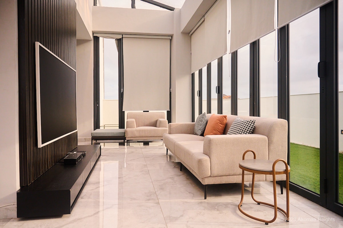 Kick back and relax in this calm, stylish space located at Shiashie East Legon. An 8 minutes’ drive from the Kotoka International Airport and 5-10 minutes’ drive to major attractions like Accra Mall, A&C Mall, University Hospital Legon, Legon Botanical Garden and many more exciting places. This hotel-styled apartment at Oasis Park Residence is furnished to themes to guarantee one a world class comfort with lifestyle amenities such as sky pool, sky gym and a rooftop terrace.
