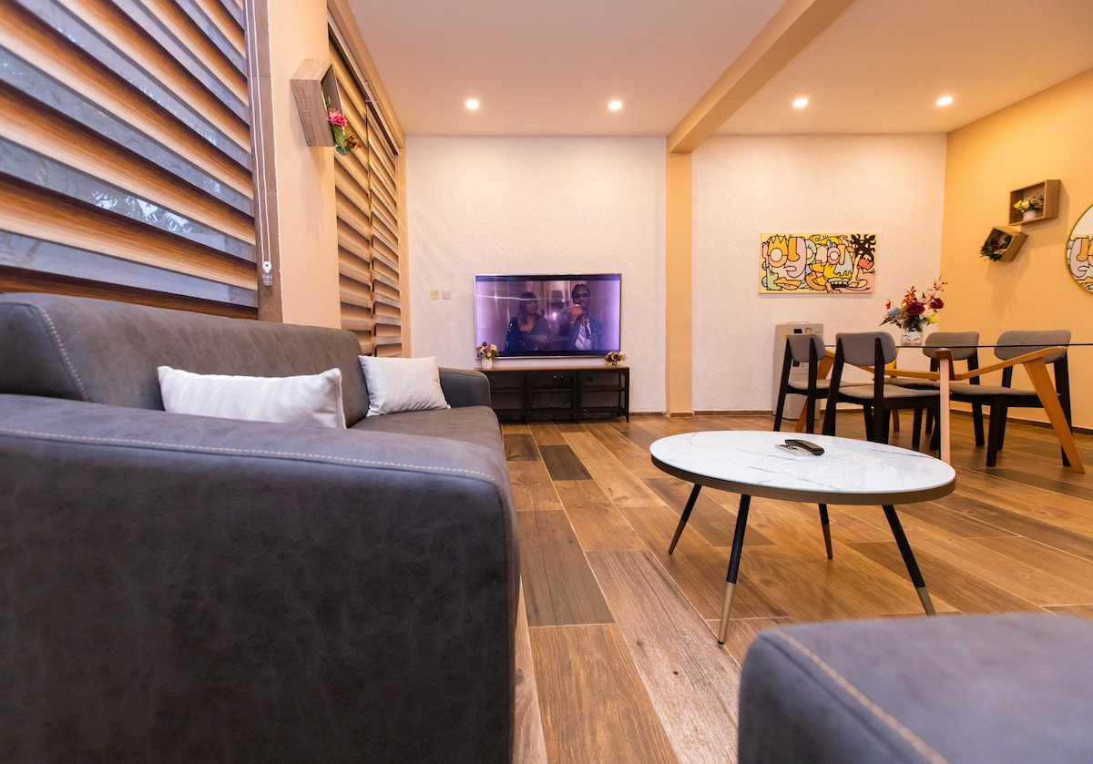 Stylish 2-BR Retreat | Families & Friends Relax in our 2-BR getaway within one secure PamV Estates property. You’ll have 2 Bedrooms, 2 Bathrooms, 1 Guest Washroom, a Kitchen, and a spacious Living/Hall perfect for families, friends, or colleagues seeking comfort and privacy. Just 5 minutes to Melcom supermarket and cafés, and about 33 minutes to the airport. High-speed Wi-Fi included.