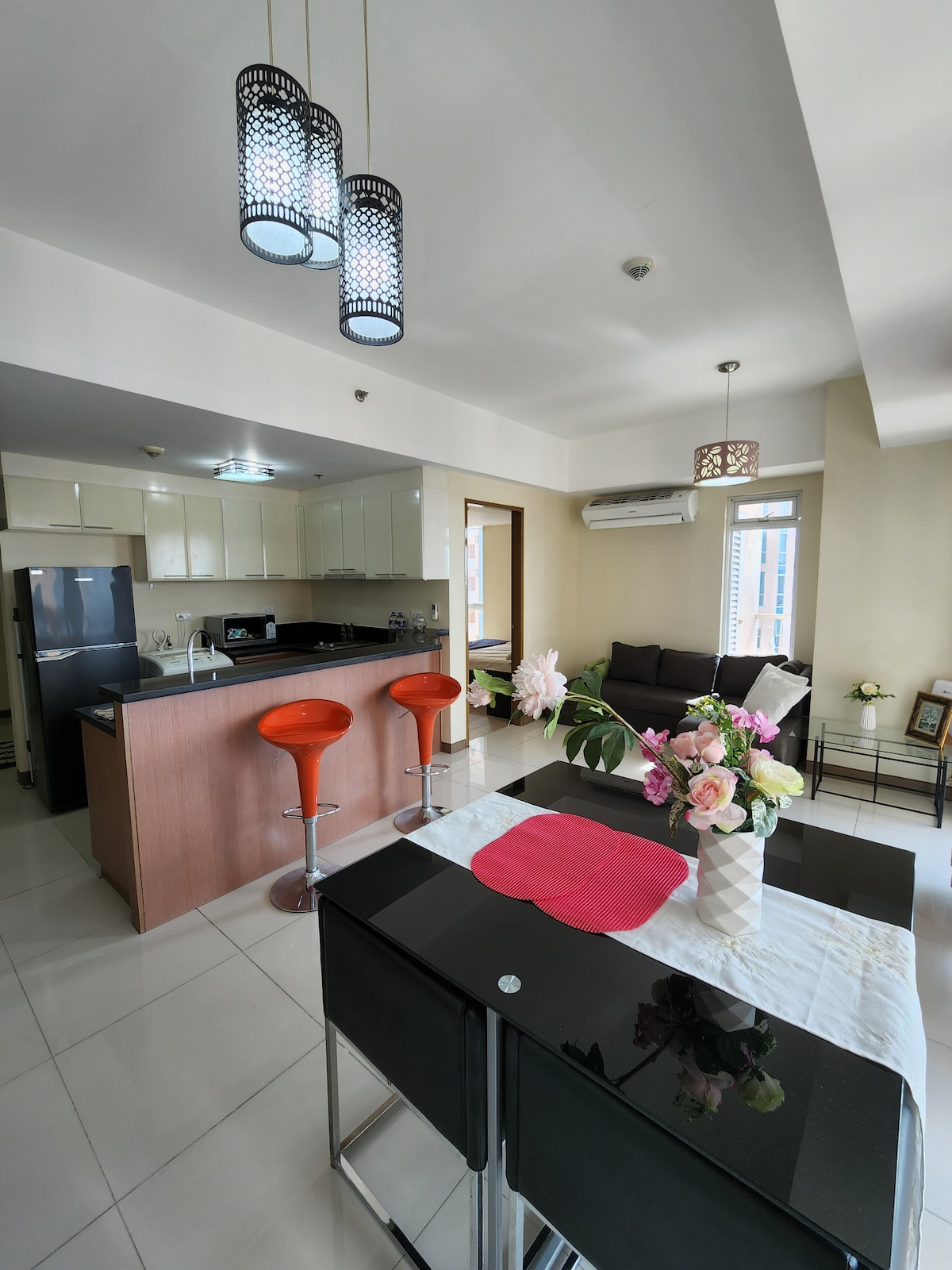 Situated on the 3rd floor of an apartment building, enjoy your stay here with your friends and dine outside the patio! What we have: -AC -Unlimited WIFI -Bingewatch all night as we have NETFLIX -Kitchen with single Induction stove + complete utensils -Refrigerator What we don't have: -Water heater -Projector (the one in the photo) is owned by the previous tenant -Parking area (but there's limited street parking for motors)