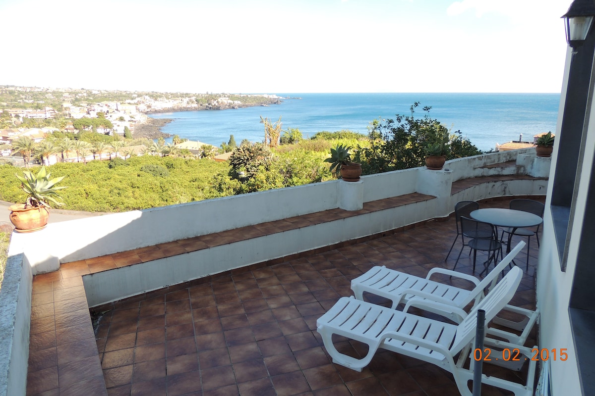 Casa teo è uno spazio ampio ed arioso che si affaccia su un giardino soleggiato e ben attrezzato. Gode di una vista di mare a perdita d’occhio, direttamente sulla Riviera dei Ciclopi. L’arredamento è essenziale ed elegante, semplice ma funzionale, ogni particolare ben curato. L’appartamento , quasi interamente rivolto verso il mare, è una recente ristrutturazione di una casa del primi del 900 : -la zona pranzo/soggiorno dà direttamente sul giardino ed è attrezzata per ogni necessità -la camera da letto matrimoniale ha un bagno esclusivo -un ulteriore soggiorno dispone di due divani letto e di un altro bagno. Il parcheggio è privato, così come la discesa al lungomare Scardamiano di AciCastello, ricco di stabilimenti balneari forniti di ogni servizio. Si può raggiungere a piedi il centro di Acitrezza in pochi minuti.