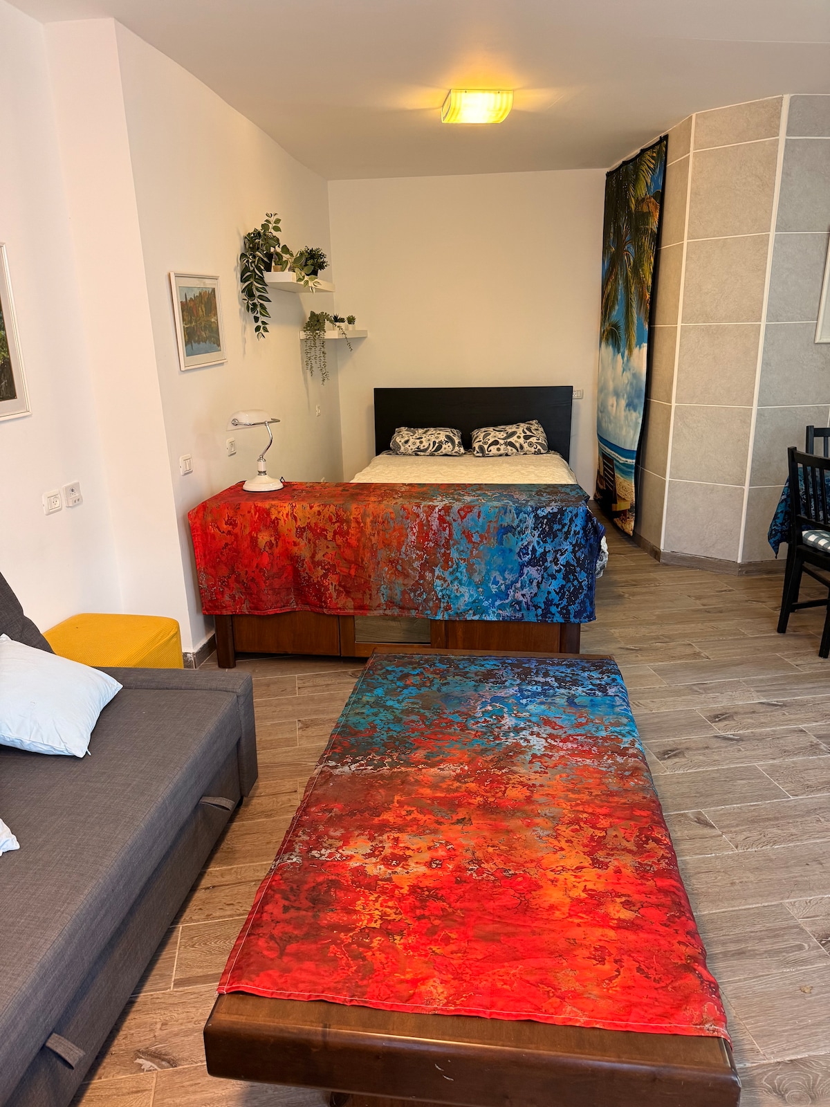 This quiet and cozy guesthouse has a lovely patio surrounded by trees. There is private parking and a private entrance. There is air conditioning and ceiling fans. In Harduf there is a shop, an organic vegetable market, a cafe, a coffee truck, a petting zoo, a playground, many walking trails. In the summer there is a pool. The guesthouse includes a living room, a fully equipped kitchen, a bathroom with a shower, towels, shampoo, conditioner and soap, and a bedroom with a double bed.