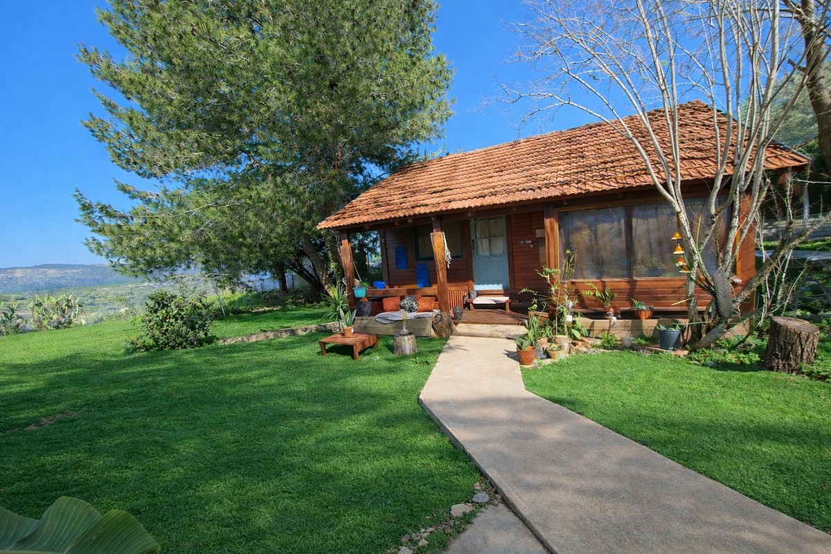 A magical cabin in a Galilean landscape, equipped with everything, overlooking the forest with an outdoor garden and a mountain view A pampering outdoor double bath Outdoor seating area, fire table TV with a variety of channels wifi Air conditioners in the bedroom and in the living room Fully equipped kitchenette Herbs in the garden for tea Nespresso machine sheets and towels, Hot water system Option for delicious double breakfasts