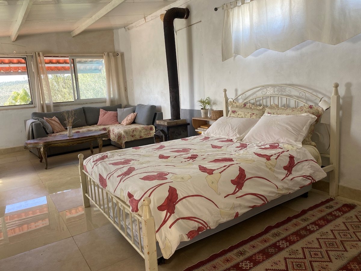 A beautiful, cozy space in a Nature reserve village. perfect for a young couples The studio with lots of light and a unique view over the mountains through wooden windows or from your rooftop terrace. You'll have a romantic wooden gallery. Enjoy the handbuilt kitchen and the fresh smell of lavender. You will get a huge bath, perfect for relaxing, after the long hikes around the natural reserve of the Galilee heights the most beautifull part of the north.