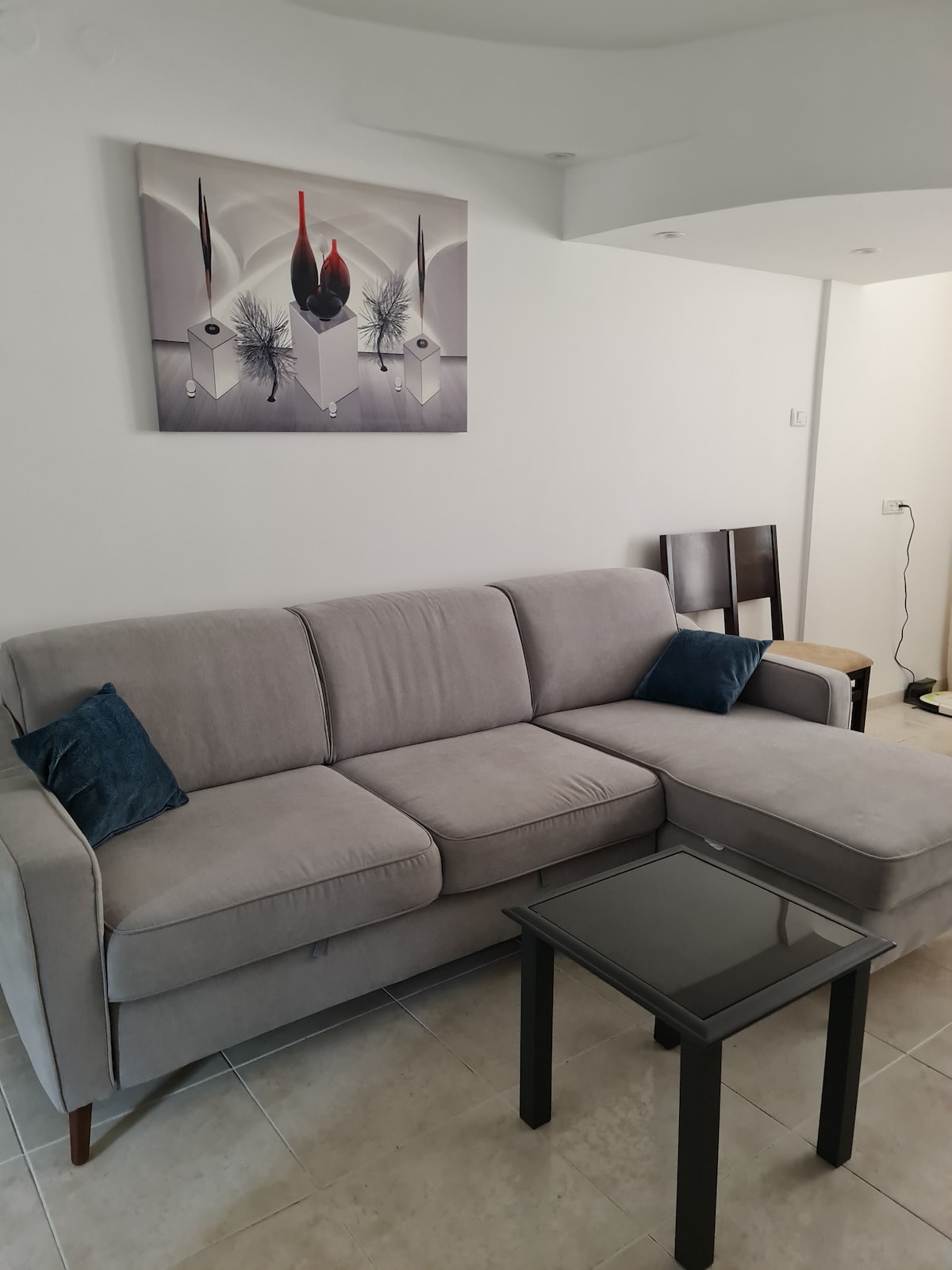 A new luxurious apartment, located 150 meters from Argaman Beach with a fully equipped modern kitchen. The dining and living room area opens up onto a spacious enclosed glass balcony overlooking stunning Acre bay with amazing views of the old city of Acre on one side with a great view of Haifa bay on the other side. You feel like you are vacationing abroad . The sunsets and views are Marvelous.