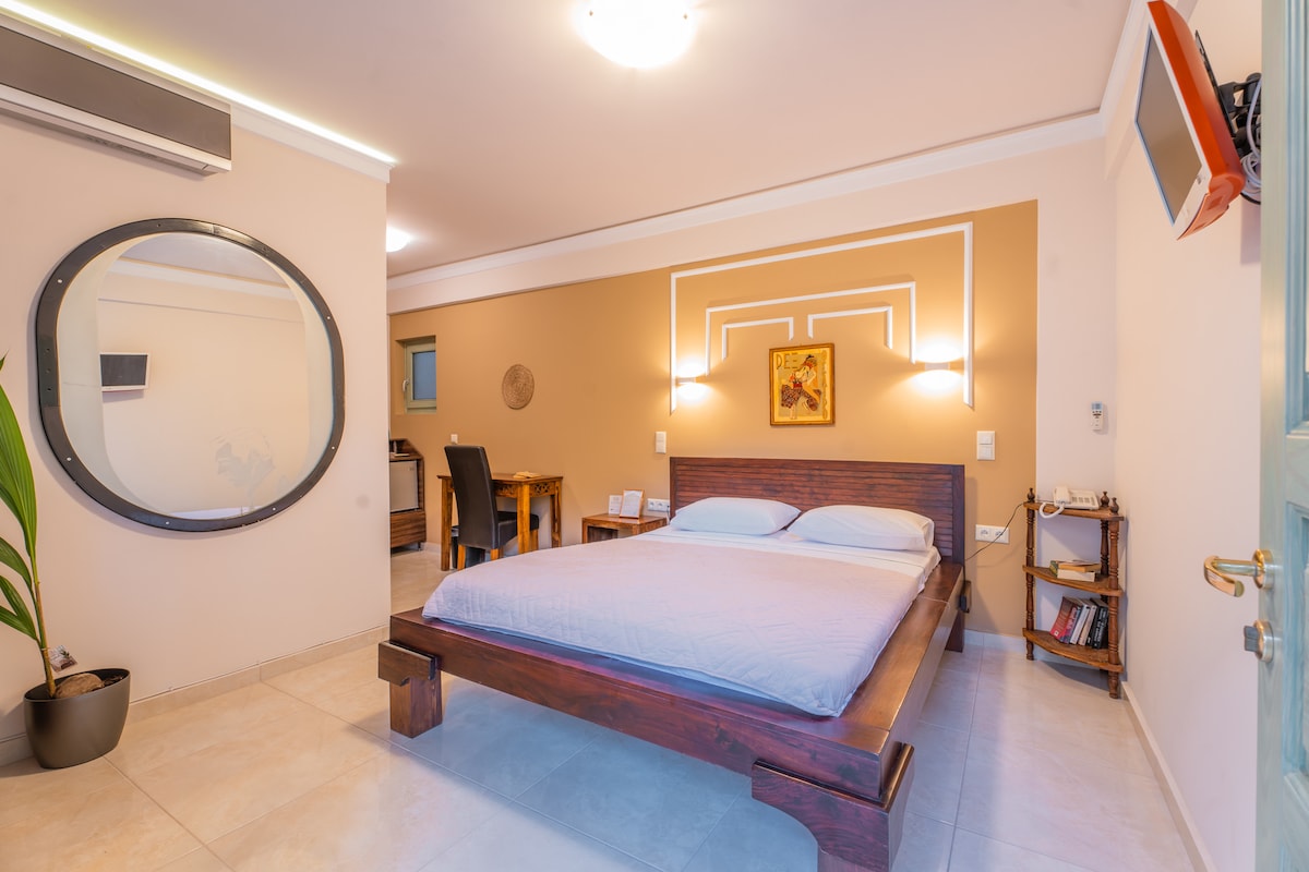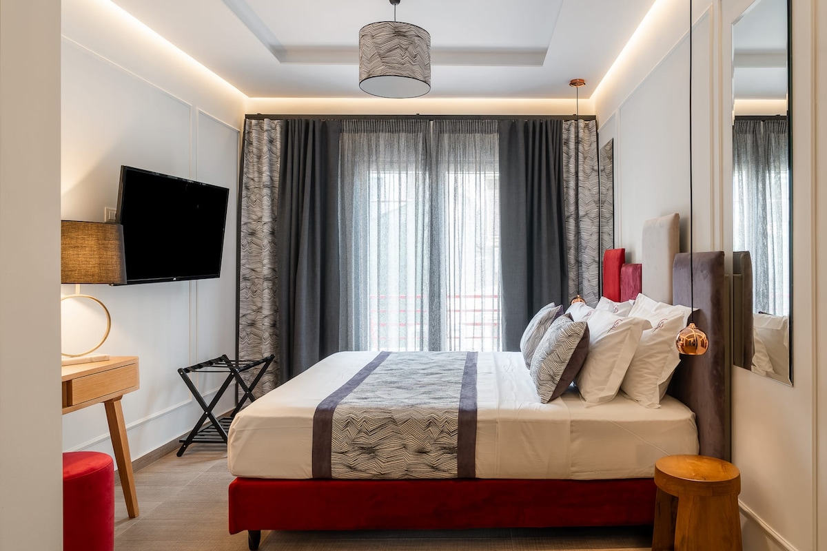 A bright, comfortable room with a clean modern design and soft neutral tones, offering a cozy stay in the heart of Athens. Enjoy a comfy double bed, wooden floors, a modern bathroom with shower, A/C, free Wi-Fi, and a fridge for your essentials. Large windows frame the city views and fill the room with natural light. Start your day with complimentary lobby coffee, and end it on the rooftop with panoramic views and a relaxing jacuzzi.