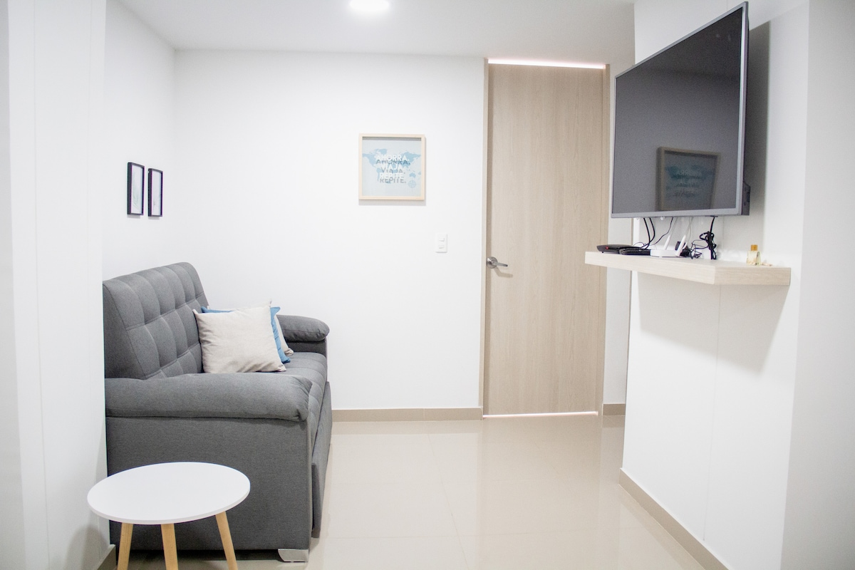 EXSTR APARTMENT ERE CENTENARIO 202 🌴 Stay in comfort and style in this elegant second-floor studio, ideally located in walkable Centenario — steps from the culture, gastronomy and nightlife of Bulevar del Río, Granada, and El Peñón. Featuring a European King bed, A/C, SmartTV, unlimited hot water, and a fully equipped kitchen. Dedicated fiber-optic internet (99%+ uptime) makes this a rare find in Cali, perfect for digital nomads, executives, solo travelers, and couples seeking a premium stay.