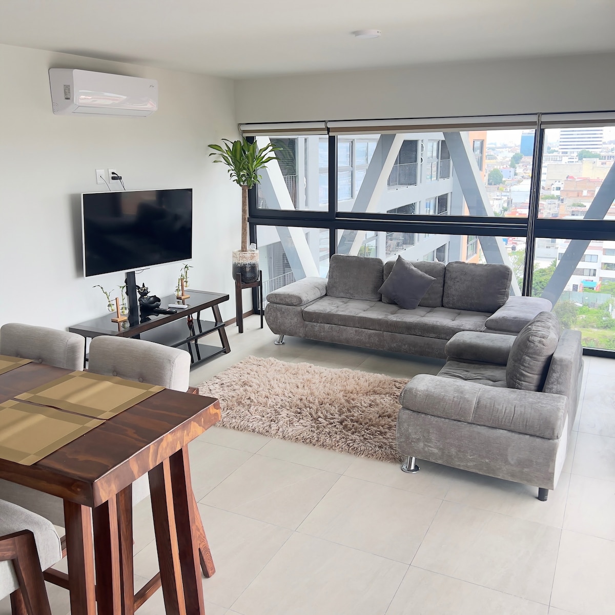 Departamento ubicado en el corazón de Guadalajara, en el piso 13, con vistas increíbles a la ciudad, consta de 2 recamaras y área de sofá cama en la sala, la torre departamental cuenta con área de amenidades, alberca, recepción, seguridad 24/7, gimnasio, elevadores y estacionamiento techado gratuito para 2 autos. El departamento incluye todos los servicios tales como wifi de alta velocidad, pantallas Smart, electrodomésticos, aire acondicionado y algunas cosas mas. Alberca no disponible en enero