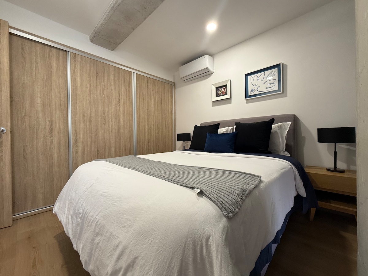 - Acogedor y exclusivo estudio ejecutivo con cama queen-size, escritorio y aire acondicionado. - Balcón para tomar aire fresco. - Cocina equipada. - Ingreso con cerradura inteligente y clave personalizada y exclusiva para cada huésped. - Rooftop panorámico con restaurante en el nivel 9. - Sala de juntas equipada para reuniones profesionales (consultar disponibilidad). - Acceso 24/7 con código personalizado. IMPORTANTE: No contamos con estacionamiento privado dentro de la propiedad.