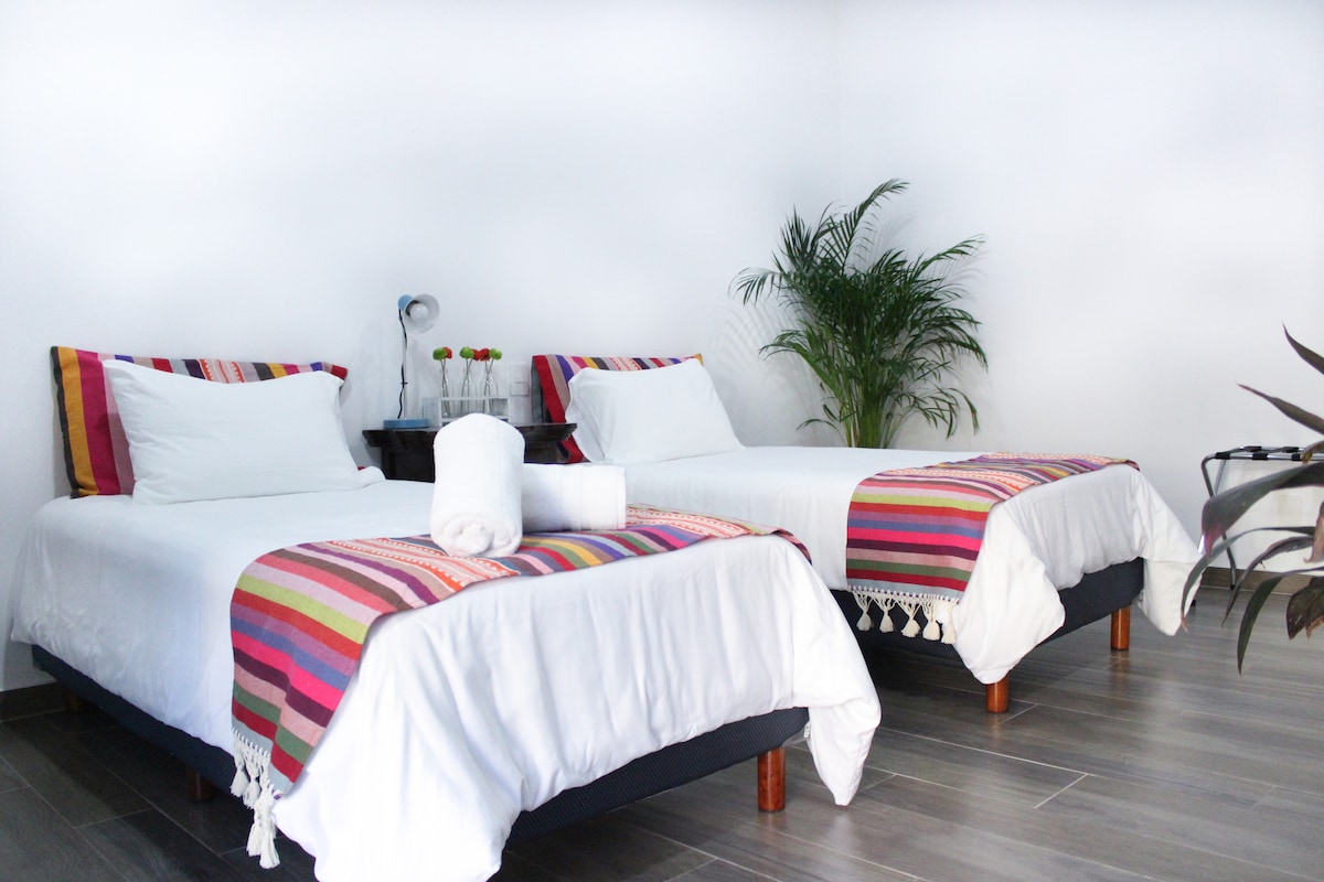 MORADA LIVING Perfecto para amigos, compañeros de trabajo o viajeros que prefieren dormir por separado, este estudio ofrece dos camas individuales, sofá cama, cocina completa, Smart TV y escritorio. Su diseño moderno lo hace práctico y cómodo para estancias cortas o largas. El edificio cuenta con áreas comunes agradables y se encuentra en una ubicación estratégica: cerca del Centro Histórico, Colonia Americana y Parque Agua Azul. Comodidad, flexibilidad y ubicación en un solo lugar.