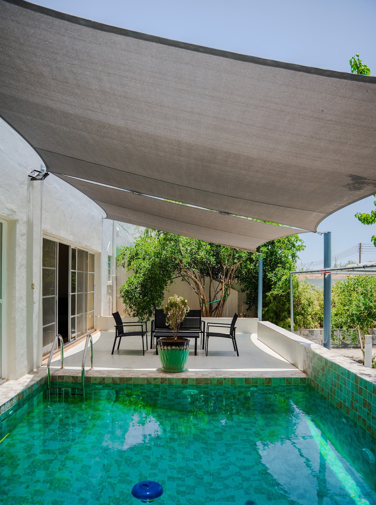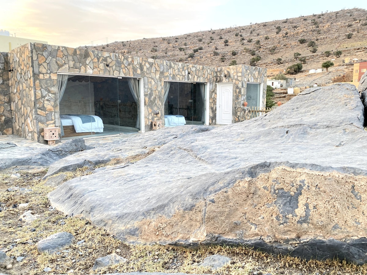 Albustan means ‘farm’ in Arabic. The location of the house is on the edge of the farms of Misfat Al Abriyeen. The charming house is surrounded by dates, bananas, papayas, lemons, and a variety of other fruit trees. From the semi-outdoor patio, immerse yourself in the fresh, green landscape and the fragrant scents of nature. The house features one cozy bedroom and two basic toilets/showers and a kitchen.