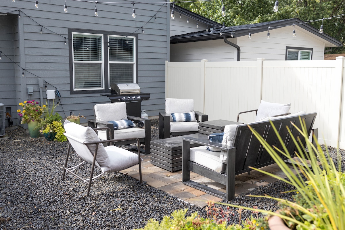 "Modern Retreat in Boise’s Hyde Park!" Located on the best block of Hyde Park, steps from restaurants, cafes, bars, yoga, and bike rentals. This single-level home offers a fully equipped kitchen with stainless steel appliances, stylish living and dining spaces, two cozy bedrooms, a TV room with a pull-out platform bed, and a workspace. Features include a full bath with a smart shower, a half bath, Nest temperature control, self check-in, a fire pit, and off-street parking for your convenience