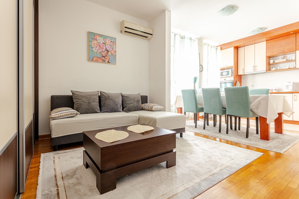 A modern style and freshly renovated apartment in New Belgrade. On walking distance from Sava Centar, Stark Arena and Belexpocentar and has easy highway and downtown access, yet in a quiet residential neighborhood. The apartment features a self-check-in, 1st floor, separate room with a king-size bed, a fully equipped kitchen and bathroom, fast and free WiFi, and a UHD Smart TV. We renovated every aspect of Apartment Lidija to provide everything you need for a relaxing and comfortable stay.