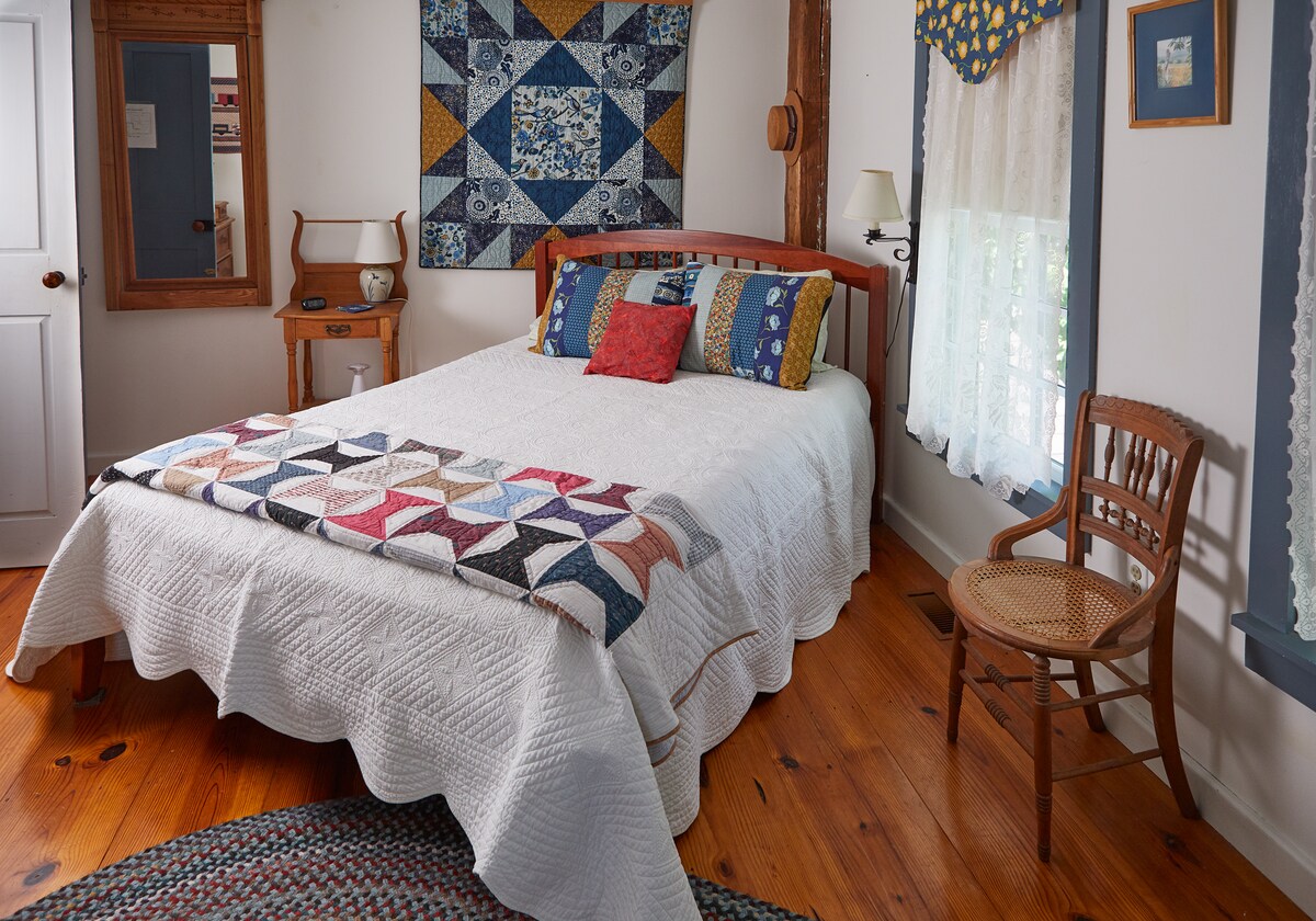 A sunny room in our 1806 farmhouse B&B, Shelley is the largest room in the Jenny cottage, a few steps from the main building. The room has its own 2nd floor private entrance and a shared kitchen. This lovely room sleeps three comfortably, with a queen-sized cannonball bed as well as a twin bed in a private alcove. The Shelley room has a spacious sitting area with wing back chairs. Guests are treated to a gourmet three-course breakfasts.
