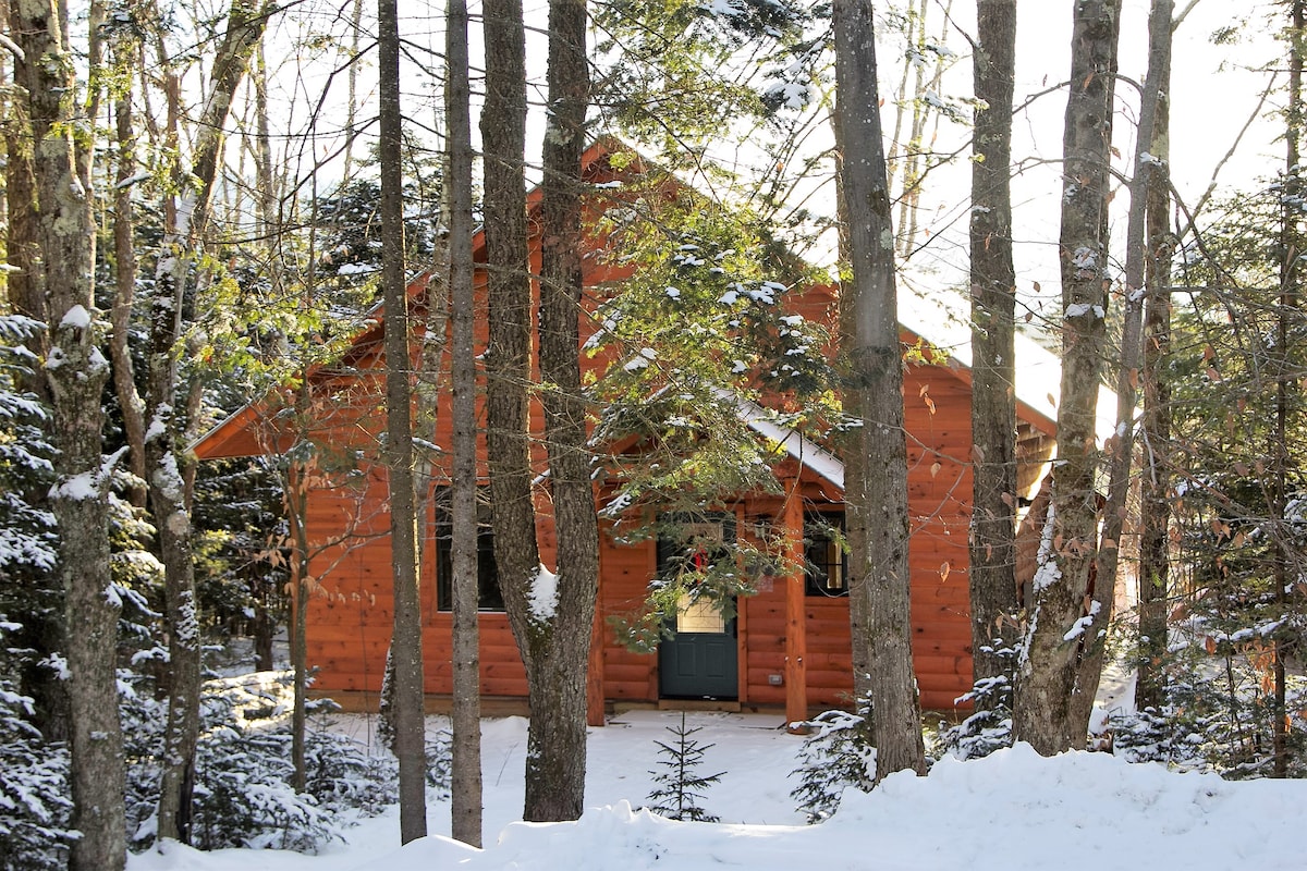 Escape to a cozy log cabin on 10 wooded acres. With a covered front porch, seasonal outdoor bath tub, large fire pit, fully stocked kitchen, hotel amenities, high speed Wi-Fi internet and Smart TV. Secluded yet nearby to ski areas, hiking, swimming holes, restaurants, breweries, apple picking and more. Just .5 miles off of RT 100, 22 min to Sugarbush, 20 min to Mad River Glen, and 39 min to Stowe Mtn Resort. 13 min to Waitsfield or Waterbury, 23 min to Montpelier, and 43 min to Burlington.