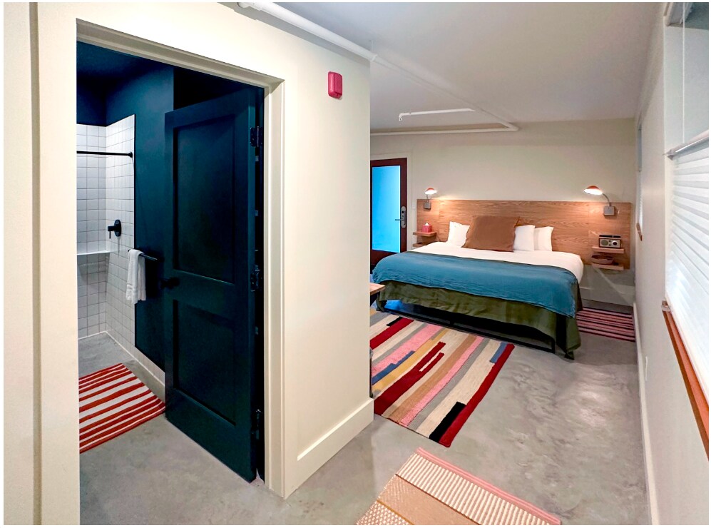 Our Sunset King room features one king bed with custom built headboard, desk, gear closet, two sitting chairs around a side table, and a deck with summer sunset views. The bathroom features a shower/jacuzzi tub, single sink vanity and bath product by Ursus Major. Please note that none of our rooms have televisions (a very intentional choice!) but there is fast and dependable wi-fi throughout the property.