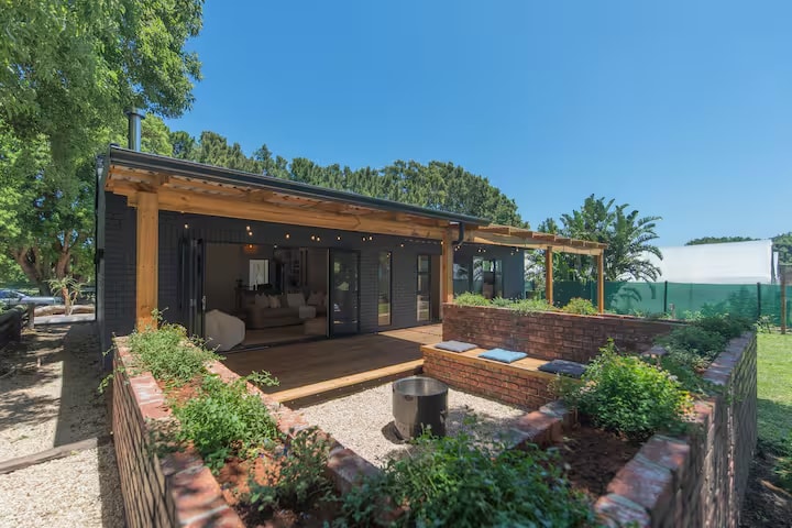 Entire, completely private and free-standing, modern, stylish and spacious, self-catering house is 6 minutes from Airport. Situated in tree filled part of an upmarket suburb, neighbouring the host's safe property, 45m from street. It's EXACTLY as the updated pictures show. Beautiful interior and quality furniture and appliances throughout. Upmarket restaurants and shops under 3 min drive.The private parking for 2 cars and private patio, BBQ, garden, AC and fast WIFI, all for only you to enjoy.