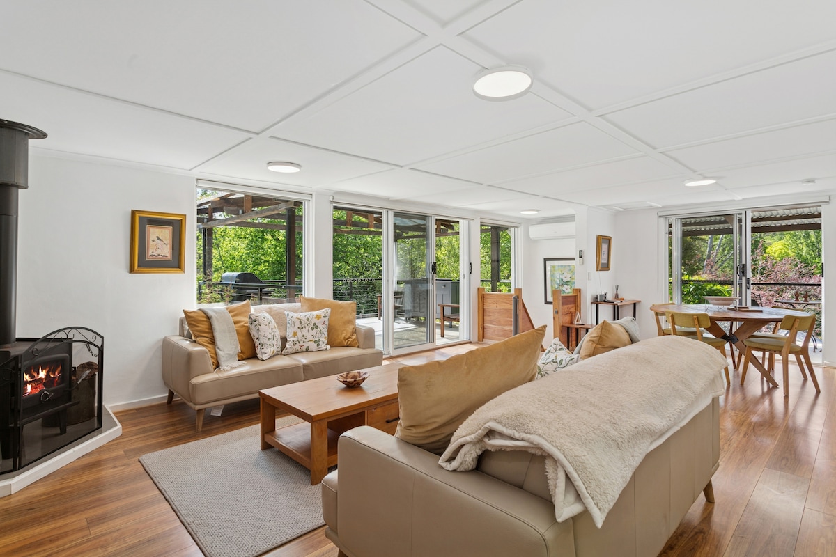 Enjoy nestling by a cosy log fire or revel in relaxing walks in a natural scrub setting. The property is a turn of the century railway cottage, fully renovated, and all within walking distance to cafes and country pubs. This peaceful house is very suitable for anyone requiring post operative rest or needing a quiet space during a serious illness. There is also a separate studio on site for a carer, if required.
