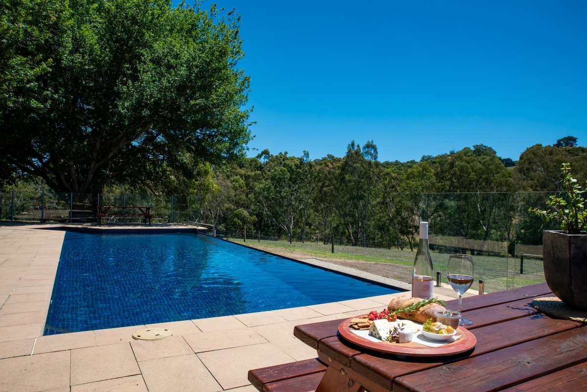 Relax in the tranquility of the Adelaide Hills as you enjoy views of a working farm with rolling hills, vineyard and cattle. Ideally located in the heart of the Adelaide Hills adjacent to major wineries and cellar doors - including Shaw & Smith, Nepenthe and The Lane. Enjoy the pool, walks around the property or a short 5min drive to famous Hahndorf and Hills specialty stores. Large enough to accomodate extended family or friends while spacious enough for a private couples escape.