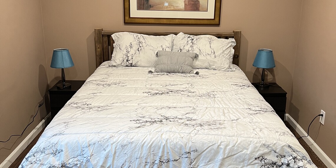 I'm pleased to share my latest design after a two year renovation project! This finished basement has been totally renovated and designed with lots of great amenities! It features secure parking, a private entrance, brand new kitchenette area and private bathroom, dedicated workspace, LOTS of windows for natural lighting, a blackout curtain in the bedroom, and the entire ceiling has been soundproofed! Extra soundproofing has been used in the bedroom for added comfort and enjoyment!